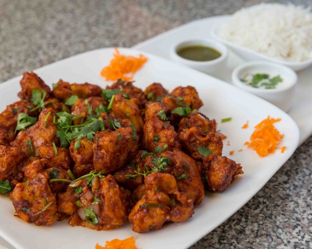 Caulifower marinated with flour, sauteed with garlic, ginger chili and soy sauce. Vegan.