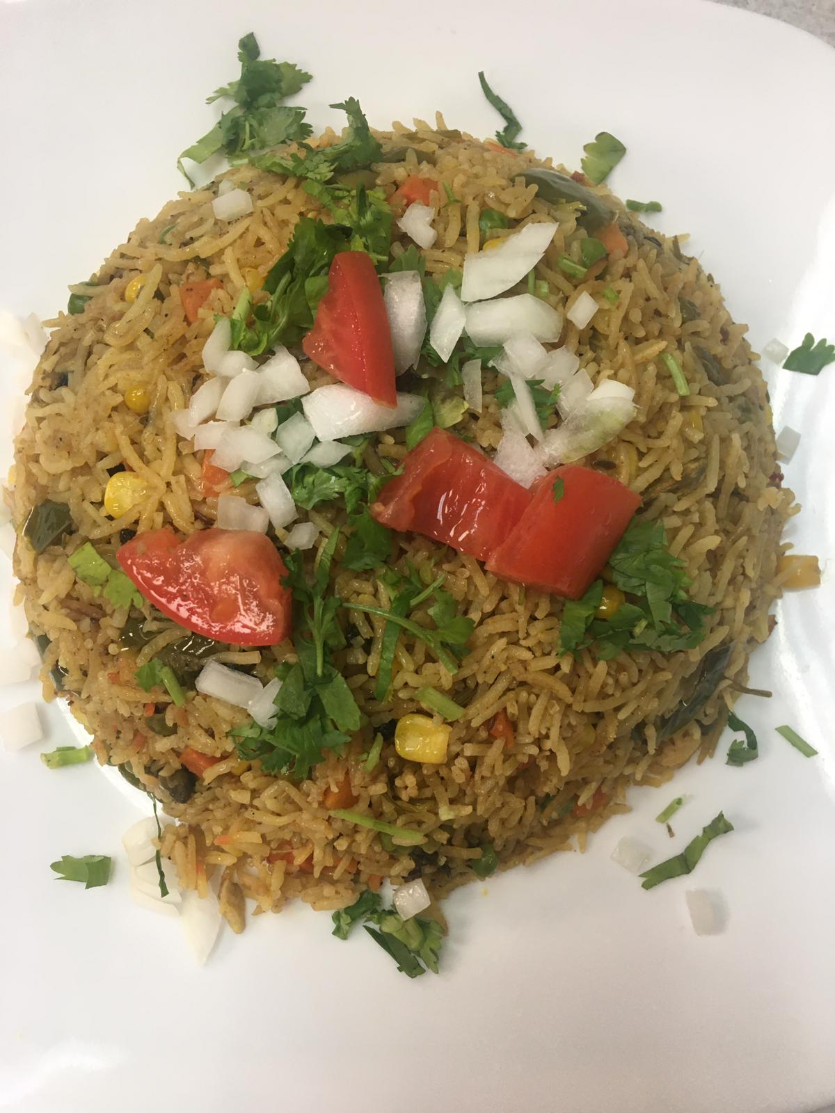 Aromatic saffron Basmati rice, cooked with fresh vegetables and fresh herbs.  Vegan